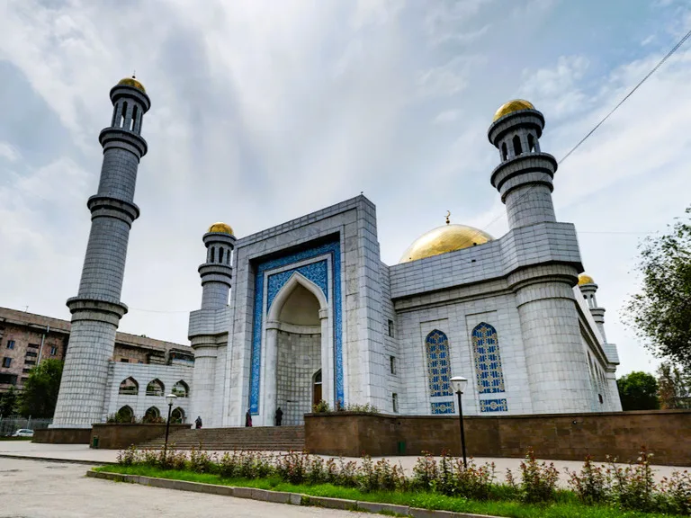 中央モスク(Almaty Central Mosque)は、カザフスタン最大級のイスラム教礼拝所。1999年完成の比較的新しい建物で、白大理石のドームとミナレット(尖塔)が美しく、内部のブルーとゴールドの装飾は静謐な美を湛えています。