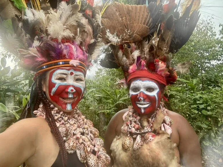 鮮やかな羽根飾りと顔のペイントで、すっかり仲間の一員に。写真を撮るたびに笑い声があふれ、彼らの陽気な人懐っこさに心がほどけていく瞬間でした。